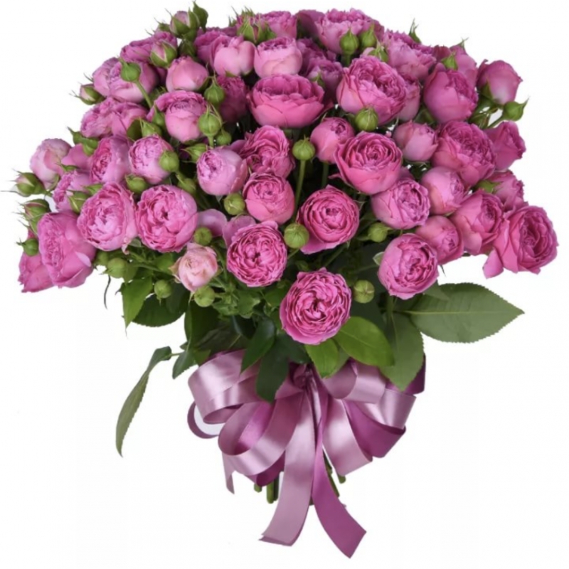 Букет состоит из 17 кустовых роз Мисти Бабблс, прозрачная упаковка, атласная лента.