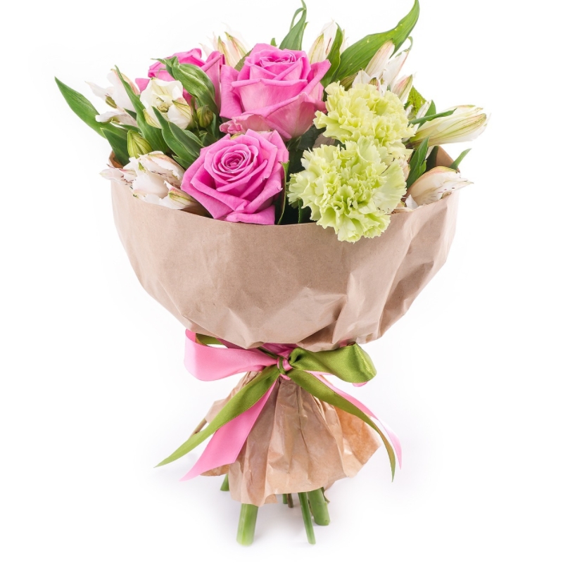 Букет состоит из 3 розы, 2 гвоздики, 4 альстромерии, крафт, атласная лента.