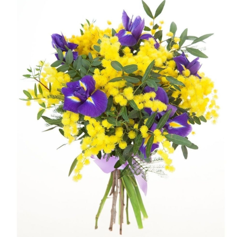 Букет состоит из 7 ирисов, 4 ветки мимозы, зелень, прозрачная упаковка, атласная лента.