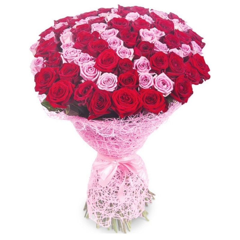 Букет состоит из 51 красная роза, 50 розовых роз, красивая упаковка, атласная лента.