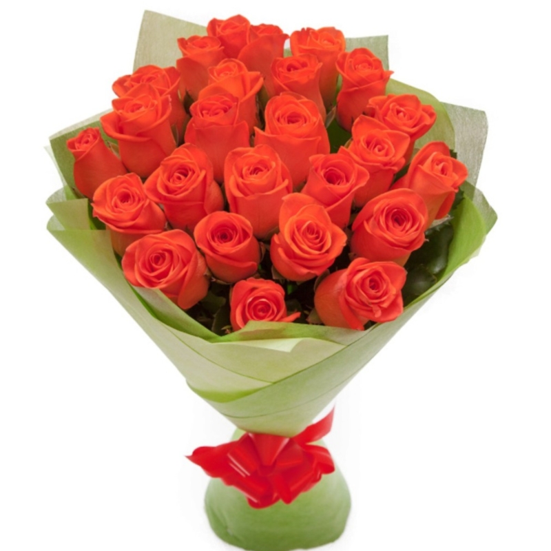 Букет состоит из 25 коралловых роз, красивая упаковка, атласная лента.